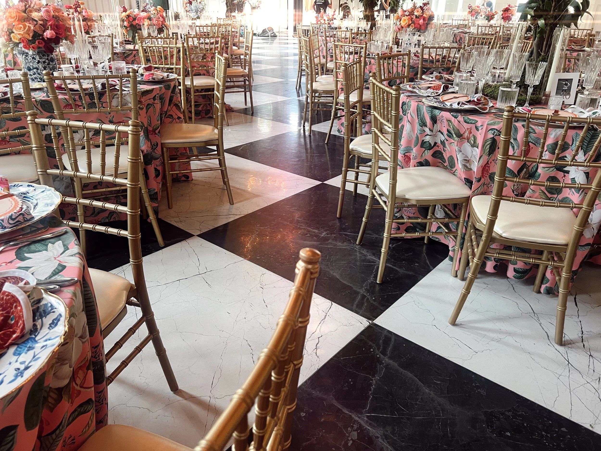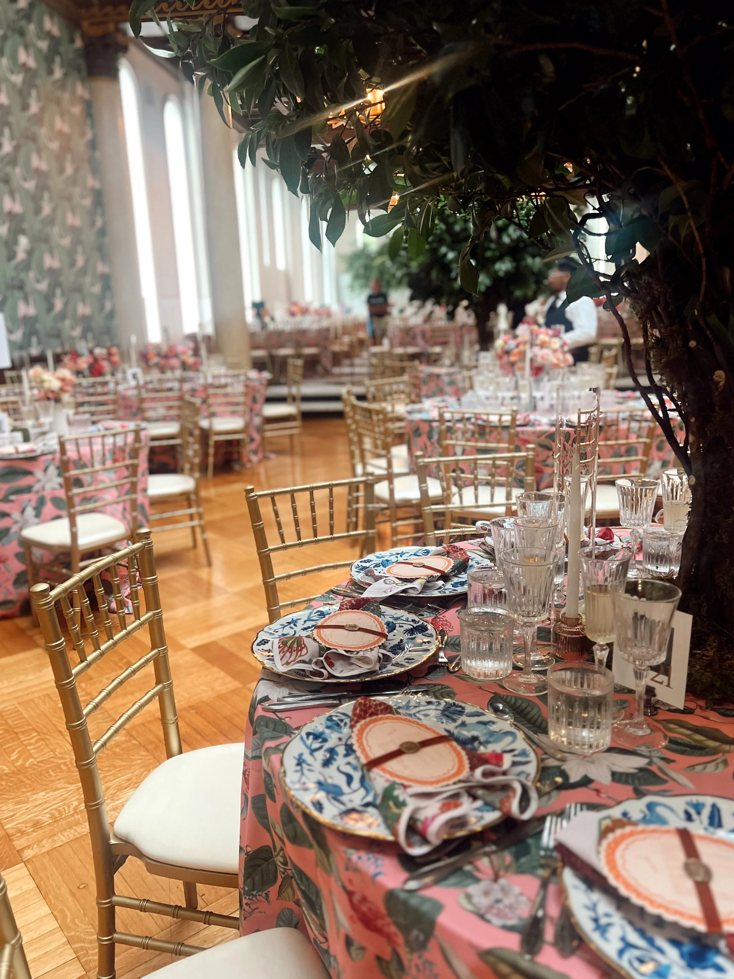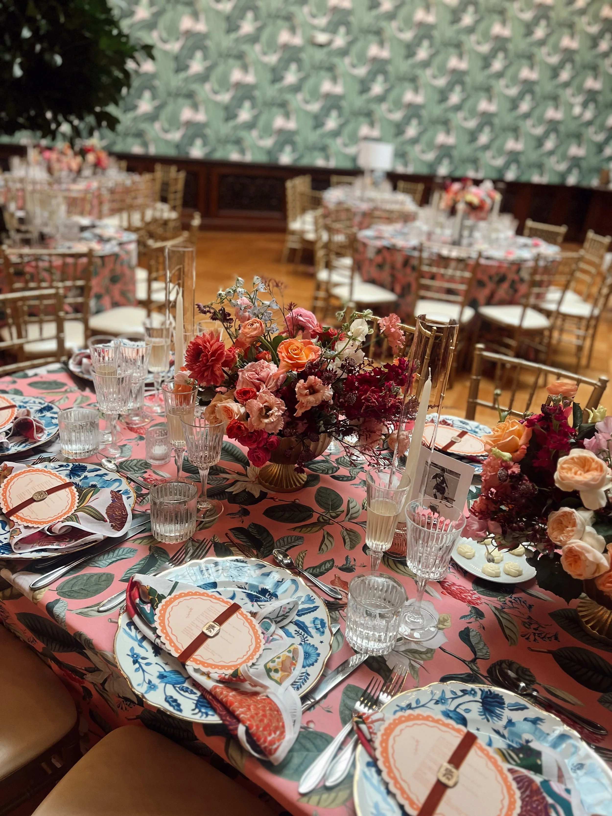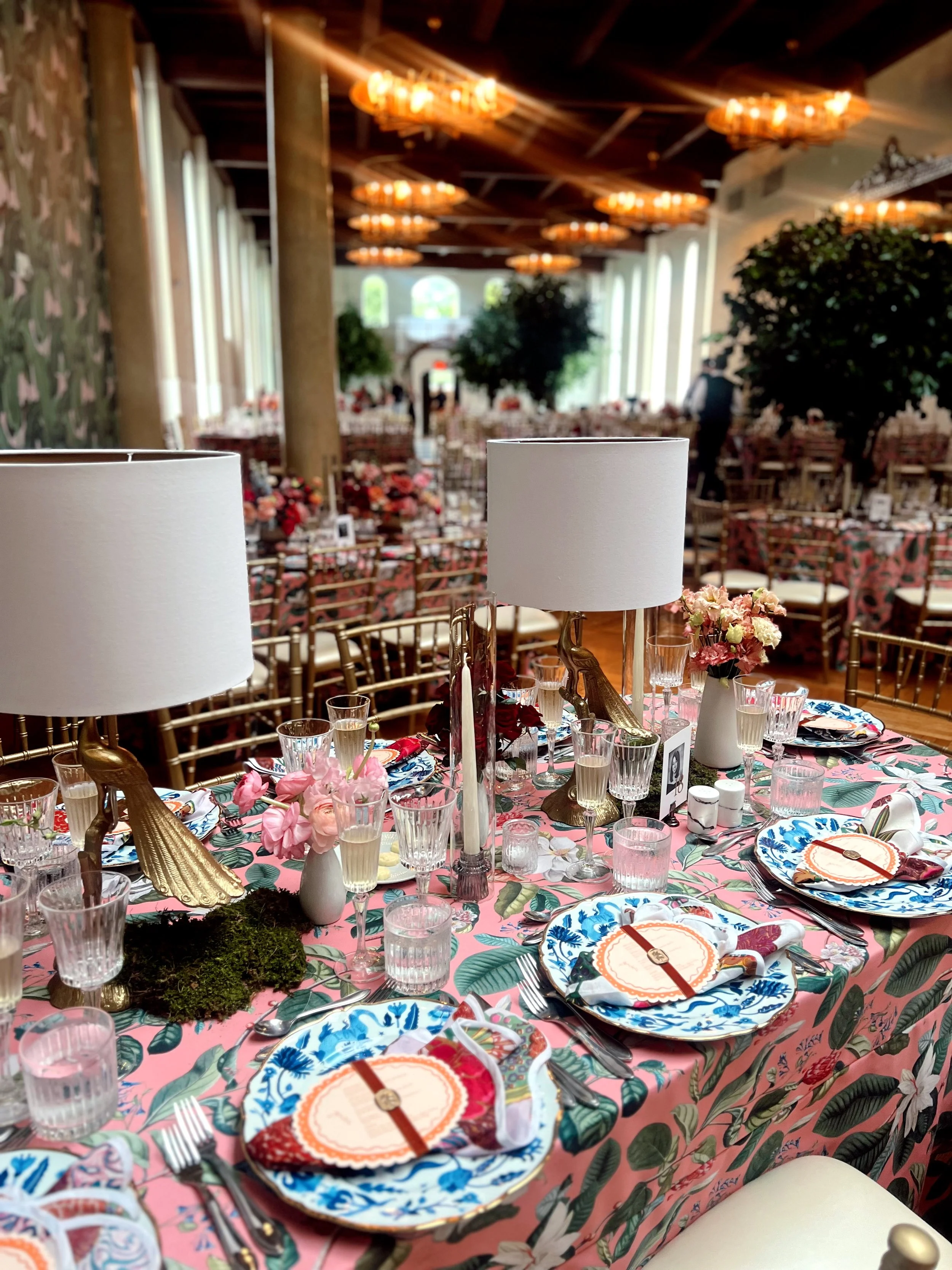 I’m sharing photos here from the evening here because I think you would have appreciated the thought that the client put into planning and combining patterns. Each table was different. (For example, this photo shows the only table with two bird lampshades as decor. Another in the space had a tree in the center, bringing in a new table shape. All combined to give the room a big personality.